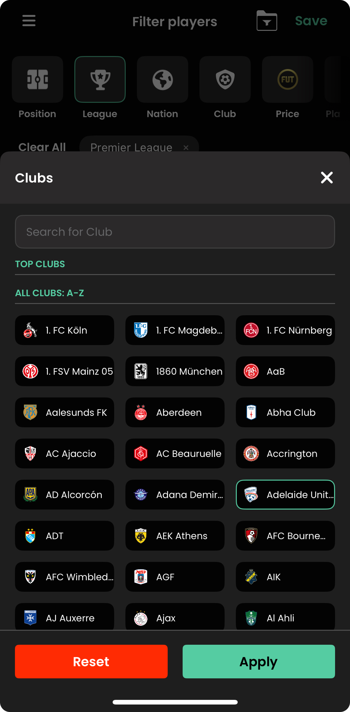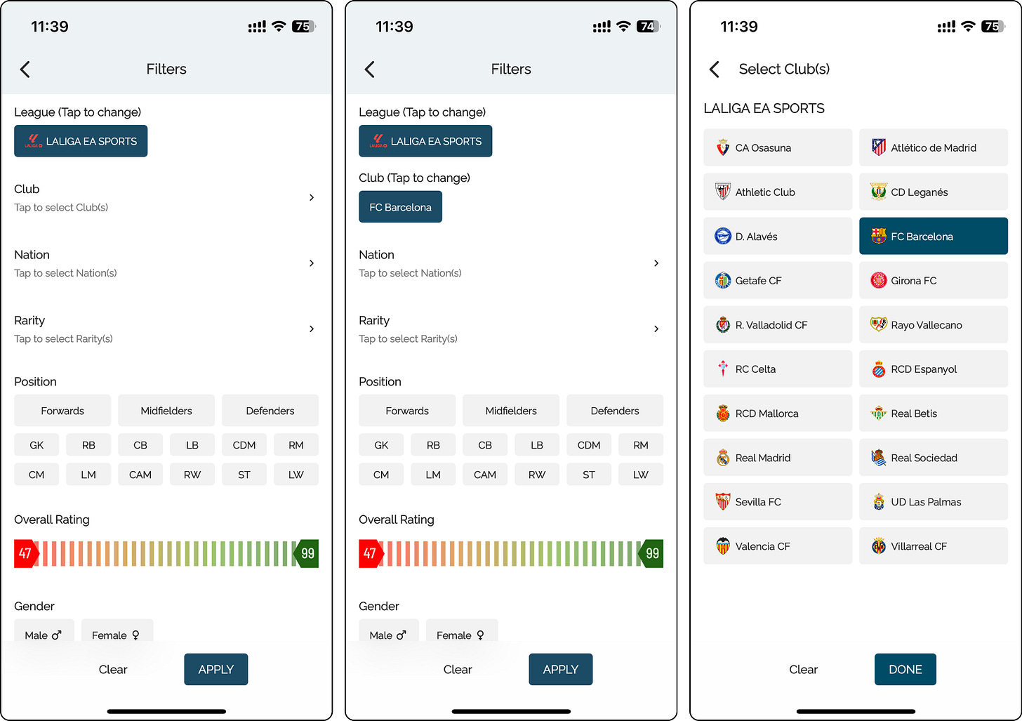 The filter system got a complete rethink. I removed every filter I’d never used in seven years of playing FIFA. The remaining filters became contextual - select a league, and you’d only see clubs from that league.